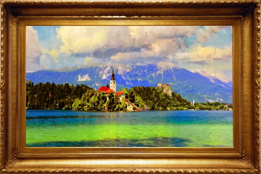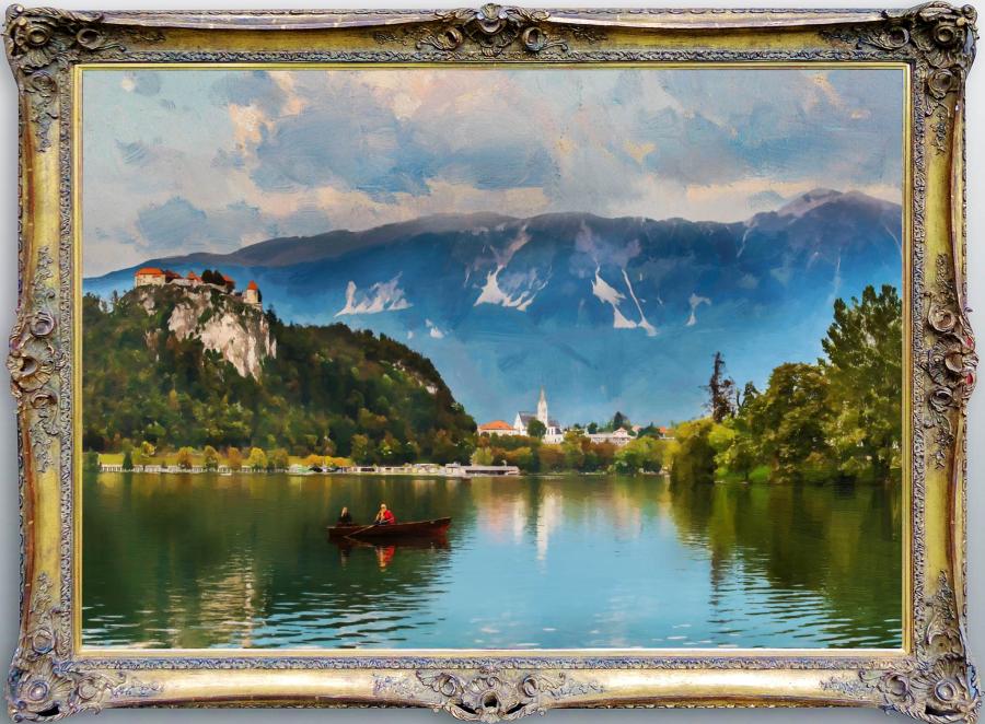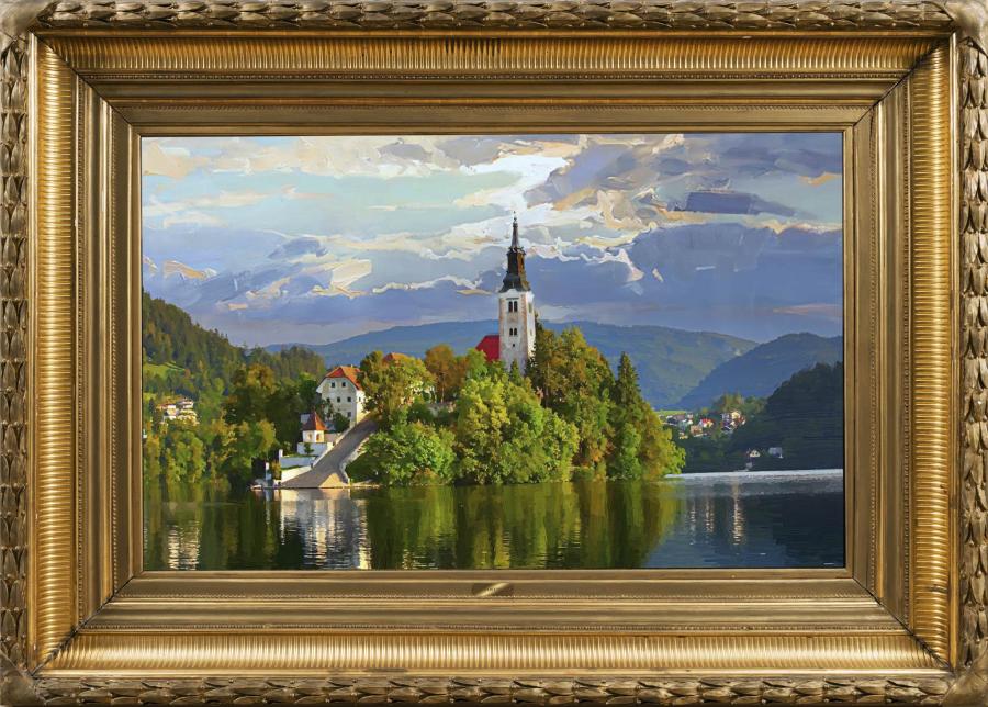 11. Bled view of the castle and lake with Stol mountain in the backdrop, 65 x 90 cm, oil on canvas, 2018 |