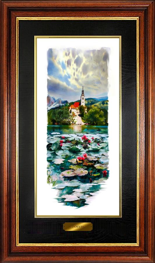 1. Bled island from the south with water lilies, 44 x 20 cm, watercolor, 2023 |