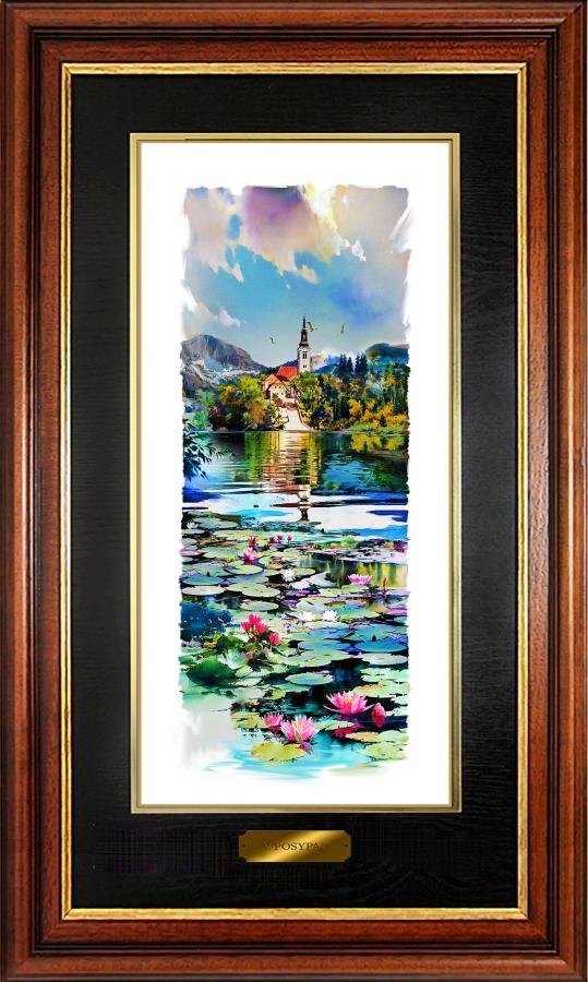 2. Bled island from the south with blooming water lilies and sun in the clouds, 43 x 20 cm, watercolor, 2023 |