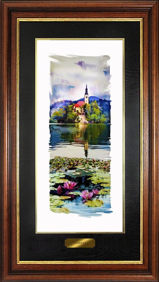 3. Bled island from the south with water lilies and aura behind the church tower, 46 x 20 cm, watercolor, 2022 |