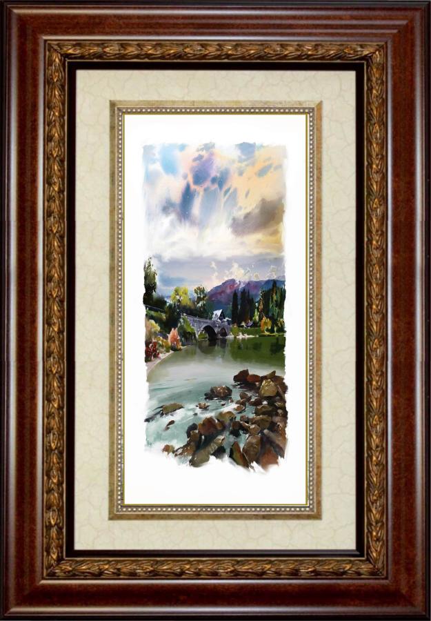 14. Bohinj lake scene from downstream the rock bridge with the river and mountains, 43 x 20 cm, watercolor, 2023 |
