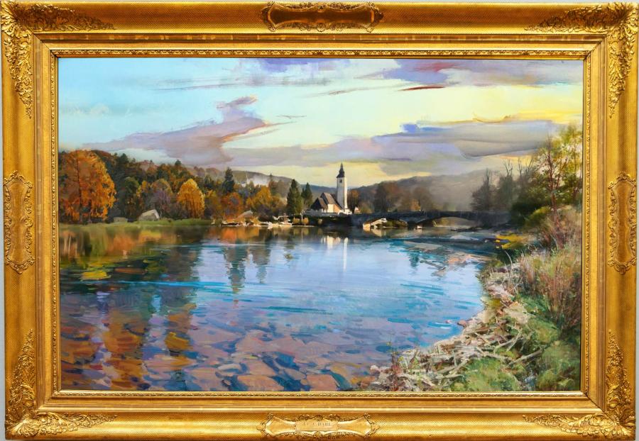 15. Bohinj wide view of the church and bridge from the lake, 95 x 149 cm, oil on canvas, 2019 |